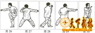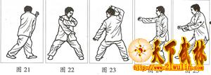 动作要点:两臂如同车轮轮番向前滚动,点打要有撑劲、顶劲、插劲。
