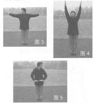 头先向右转视,同时左、右手臂侧展上托,随经头上方,直臂下按至腹前,日再转左方(图3-图5)。