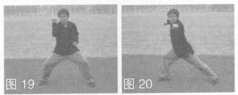 10.弓步抻拳 身体稍左转,右臂屈肘回格,随之双腿蹬拧呈弓步,右拳屈肘回拉体右侧,同时左拳侧向水平打出,目视左拳方(图19,图20)