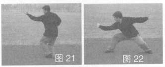 身体右转,左脚收点右脚内侧,左拳变掌上托体前,右拳回腰;接着左脚上步,左拳后摆,随之右脚再向前上步,左脚跟进呈半马步,同时右掌向前方推出,目视右掌方(图2l,图22)