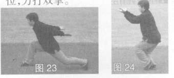 身体右转,左、右手臂后摆,随由下向一上托至面前,同时右脚震跺地面,左脚回点呈丁步,左、右肘关节微屈,目视前方(图23,图24)