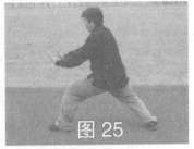 左脚前落步呈半马步,同时双掌向下劈按于体前,左、有肘关节自然伸展,上体稍倾,目视前方(图25)