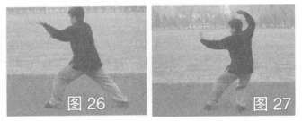 身体前移,右掌横按,左掌经上穿出;接着左脚尖回点呈虚步,同时左掌前推,右掌由下摆架头侧,曰视左方(图26,图27)