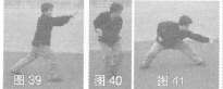 身体右转,左掌扣压右腕,随右腕向外缠绕一小圈抓握变拳,回收右腰间,同时右脚下震踏地,左脚回收呈丁‘步;接着左脚侧上步呈马步,左拳向体斜下方崩出,日视拳方(图39—图41)