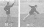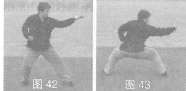 立推出,左掌屈肘回收腰问,目视右掌方(图42,图43)