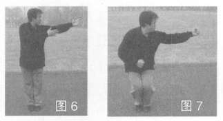 2.蹲步握拳身体稍左转,左、右手由下向体左侧上挑,高与肩平,左臂伸直,右臂屈肘,接着双腿屈蹲,左、右手握拳,左拳平肩,右拳落腹,目视左侧方(图6,图7)。