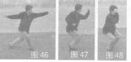 20.左右格肘 身体挺立,左脚后撤步,左掌直臂上挑,右臂随动后摆;接着左脚前卜步,右脚回点呈右丁步,同时左臂屈肘外挡肘,右拳回腰间;随后右上步,左脚回点呈左丁步,右臂屈肘外挡肘,左拳回腰间,目视前方(图46~~图48)