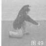 左脚上步,右脚跟步呈跪步.同时左手臂屈肘上架头顶上方,右拳直臂向体下方栽打,目视右拳方(图49)