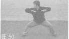 身体右转,右脚侧跨步呈马步,同时左、右拳变掌屈肘向身体两侧横顶肘,肘位高与肩平,目视右方(图50)