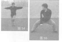 身体左转,左掌侧展开,同时左脚扣贴右膝窝;接着左脚侧落步,右脚跟进呈马步,右掌直臂变拳回挂腹前,左掌护收右腋处,目视右方(图54,图55)