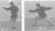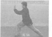 25.弓步挡手 身体右转拧呈弓步,右拳变掌,与左掌同时向体前推挡,肘臂自然弯曲,目视前方(图56)