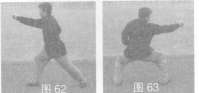 29.马步劈拳 右转身,左掌变拳直臂由下向上回挂抡摆,随之身体左转,左脚后撤步呈马步,左拳回收腰间,同时右拳直臂劈出,目视拳方(图62,图63)
