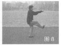 3.踩腿挑拳 身体左转,左脚前上一步,右拳直臂上挑,左拳变掌下拍在右前小臂处,同时右脚向体前下方戳踩,目视右拳方(图8)。