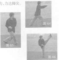 30.缠腕弹踢 右转身体,左手扣握右腕,右手外缠回收腰间,同时右脚震踏地面,左腿高弹踢出,目视腿方(图64~图66)