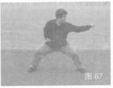 31.马步崩拳 左腿侧落步,右脚跟进呈马步,同时右拳屈肘回收腰间,左掌变拳直臂向体左侧崩打,高与肩平,目视右拳方(图67)