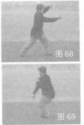 32.蹲步栽拳 身体左转一圈,左右手由下向上托摆,随之左掌回护体前,右拳下栽于裆前,同时左脚碾转,右脚合并震踏呈蹲步,目视前方(图68,图69)