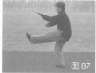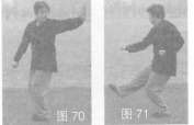 33.弹腿砸拳 身体左转,左掌侧摆一周,随回收腰间;接着右拳翻肘下砸,同时右腿向前弹踢,目视腿方(图70,图71)