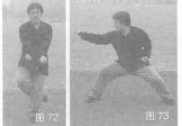 34.马步崩拳 身体左转,右脚扣贴左膝窝,左、右手臂交叉在腹前;接着右脚侧落步呈马步,右拳展臂向体右侧崩砸,左拳回收腰间,目视右拳方(图72,图73)