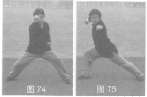 35,弓步抻拳 身体稍左转,右臂屈肘里格;接着右转身,双脚蹬拧呈弓步,同时右拳回拉体右侧,左拳向体左侧打出,目视拳方(图74,图75)