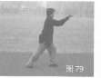 身体右转,右步向体后闪退步,同时右掌直臂平砍,左掌护击右小臂处,目视右掌方(图79)