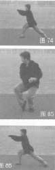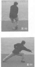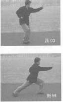 43.弓步塌掌 左掌回挂变勾至体后,左脚前落呈弓步,同时右掌直臂向体下方推出,上体稍前倾,目视掌方(图88)