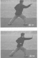 45.连环推掌 右拳变掌向上旋托,随之右脚踏地震地面呈弓步,左掌向体前直肘推出;接着左脚上步,右脚提点地面,随后撤呈弓步,同时左掌向上旋托回腰间,右掌前推,目视右掌方(图91~图94)
