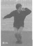 46.蹲步顶肘 右掌上挑,随后摆拧至体右侧:左脚回收右脚内侧呈蹲步,同时左臂屈肘向上顶击,目视左方(图95)