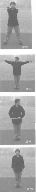 身体直立,左步侧开步,双拳变掌,平砍于体前;接着右脚并站左脚内侧,左、右手臂侧展平托,随之由上向下双按掌至腹前,目转视左方:继而,双手下垂身两侧,目转视前方(图96-图99)