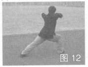 身体微左转,右臂屈肘里格;接着双腿蹬拧成右弓步,同时左拳直臂前打,右拳屈肘后顶,目视左拳方(图12)