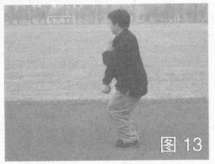 身体左后转,左拳变掌屈肘回护体前,右拳由上至下栽打至腹位,同时左脚回撤与右脚并蹲震踏地面,目视前方(图13)