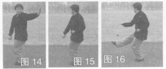 8.弹腿砸拳 身体左转,左掌直臂向后立摆一周至腹前,握拳回抱腰间,随之右拳翻肘下砸拳,同时右腿向前弹踢,目视前方(图14—图16)