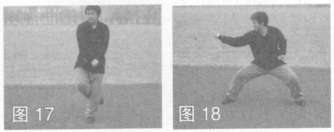 9.马步崩拳 身体左转,右、左手臂相交腹前;接着右脚侧上步呈马步,同时右拳直臂由上向下砸击,高与肩平,左手回收腰间,目视拳方(图17,图18)