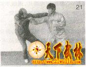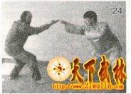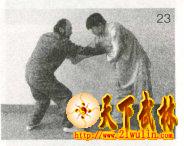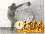 接上。外边踹击打敌方后,落腿变进步,迅速出右弹腿,用脚尖踢击敌方左腿胫骨,同时,用左掌挤滚、穿击敌方眼睛、鼻、嘴等,右手捋采带敌防打手(图22)。