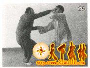 (2)双方拉开架势后,敌方欲用右拳击我面部,我把握好时机,前手(阳手)收回,后手(阴手)捋带敌右手,同时用左腿的脚掌(脚掌朝外)铲截敌方右腿胫骨,并出右掌拍(摔)敌方面部(图25)。