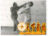 接上。铲截击敌方胫骨后落步,右手捋带敌方挡架之手,同时用右脚掌(脚掌朝外)铲截敌方左腿胫骨,左手拍(摔)掌击打敌方面部(图26)。