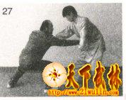 趁敌方被动挨打之际,我右腿迅速落步,左手捋带敌方防打手,同时,右手沾黏压住敌方左臂,急变中拳击打敌方心窝、丹田穴等(图27)。