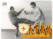 中拳击打敌方后,突然起身用脚尖点击敌方裆部,同时,引手掌抱势护住中线,用双眼紧盯敌方可随时变化(图28)。