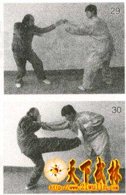 双方拉开架势后,敌方突然出右拳击打我面部,我前(阳)手迅速收缩让过来拳,然后顺势挑拿捋带敌方右臂,同时抬右腿、以脚尖为着力点发正踹腿击敌心窝(图30)。