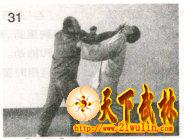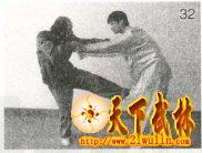 摔掌击打敌方面部后,我右手收回时捋带住敌方防打手,并发左点裆腿,袭击敌方裆部。同时,左掌击敌方咽喉、天池穴、华盖穴等(图32)。