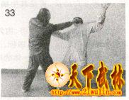弹腿回缩落步、迅速追击上右步,左手回手捋带敌方防打手,同时,右手顺势以掌轮为着力点,追步用劈山掌劈击敌方下颌、三山穴、耳穴、太阳穴等(图33)。