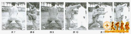 (4)高低苗盘练时的场地可大可小,当打到场地的尽头后,要回身反手撩裆,接上步掏心捶,再接高低苗打回来,打到场地尽头后再打回去,这样,一去一回,再去再回,来回盘打几十遍,日久则功深,其中回身反手撩裆(图6)和上步掏心捶(图7)两式是高低苗来回盘打时的衔接动作。