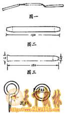 木制袖鞭由三个鞭节(图二)、八个连接环(图三)、两个羊眼圈(图四),共15个零件组成。