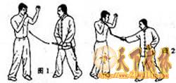 攻击示范:敌持刀与我对峙,我以“双手持鞭式”对敌。当敌持刀劈来时,我迅速以短促的“螺旋鞭”打击其持刀之手,必将使其手伤刀落(图11、12)。