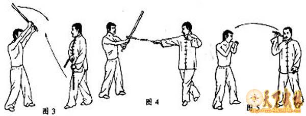 防守示范:当敌方持长器械(刀、棍)欲向我劈来时,我猛然用鞭斜向抽挂敌持器械1/3处(手握处向上1/3处),将其带偏,然后攻击(图3、4)。
