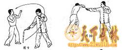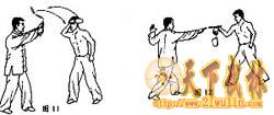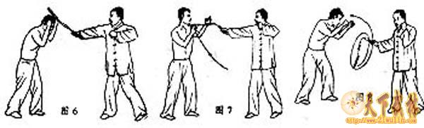 攻击示范:敌我对峙,我突然进攻,劈击敌方头部;敌若后退避开,我则以鞭梢上挂其下巴(图5、6、7)。