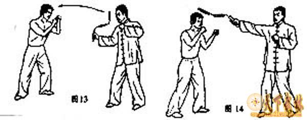 攻击示范:敌我对峙,我腋下夹鞭,突然抖击对方面部,致其重伤(图13、14)。