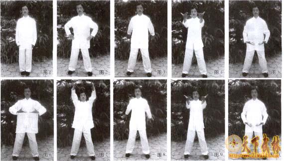 (4)两掌从腹前白然左右分开垂十体侧,放松站立(请参看图1)。