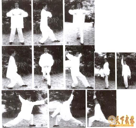 (3)右臂向上划弧至头右侧,拳心朝左;左臂自然下落至裆前,拳心朝右,目向左视(图19)。