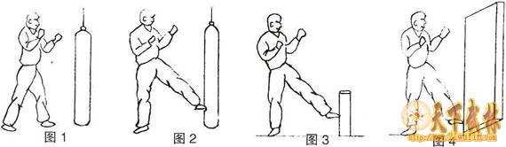 选择一堵坚硬、厚实的墙体作为练功道具,练功者以金刚守门式(实战式)站立在距离墙体40厘米处,双脚交替踔踢厚墙各二百次,其他要求均同上(图4)。