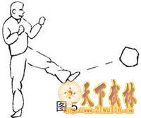 备10块2公斤重的小石块,10块5公斤重的中石块,10块15公斤重的大石块,石块表面应光滑,以免误伤脚趾。练功者以金刚守门式(实战式)站立在石块前,双脚交替踔踢石块。先踔踢小石块,待能轻松把它踢飞而脚趾不觉疼痛为成功;然后再踢中石块,最后练习踔踢大石块,皆以能将石块轻松踢飞而脚趾不痛为度(图5),至此,少林踔腿功功成,用于实战威力极巨。